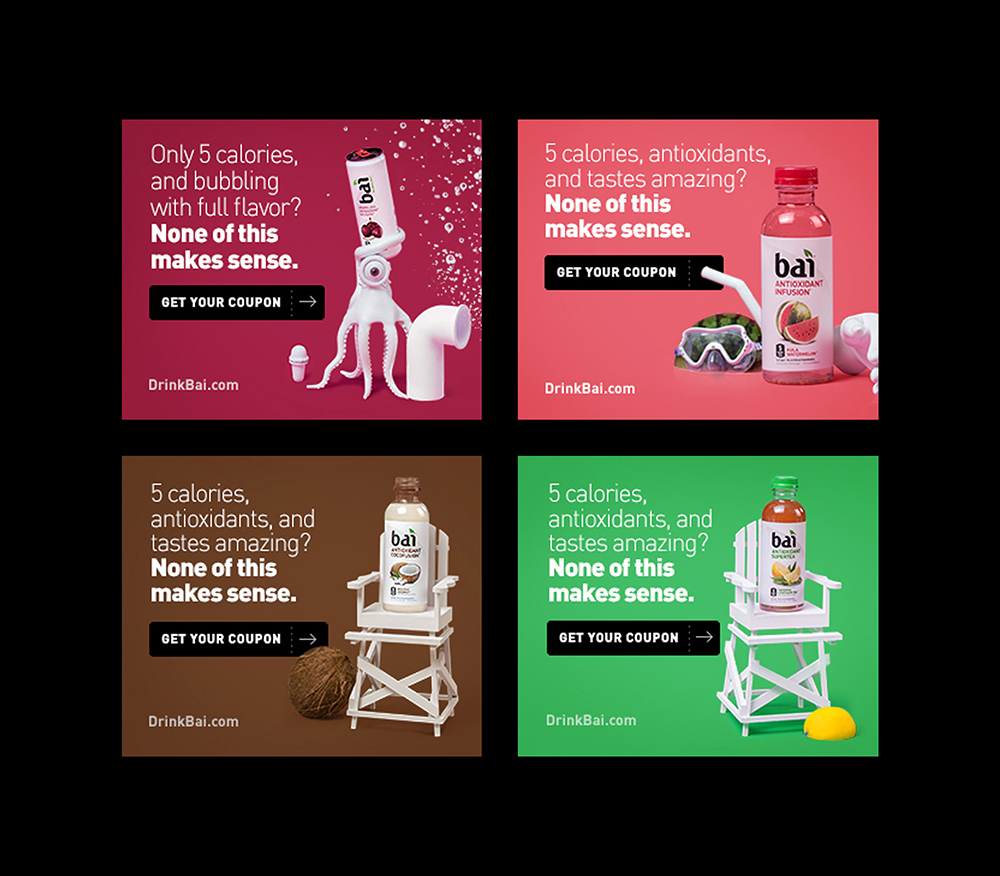 Bai is a beverage company that makes flavored water infused with antioxidants. To help the Marketing and Sales team with their summer campaign called “None of This Makes Sense,” I created: